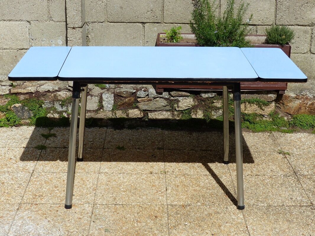En excellent état compte tenu de son grand age les chaises assorties, également de couleur bleu et le tabouret (formica gris. Les meubles en état restent très prisés pour leur look décalé. 120 / 80 / 74 cm dispose de 2 tiroirs de part et d'autre de la longueur. Table de cuisine en formica d'un très beau bleu. Table de cuisine formica avec rallonge.